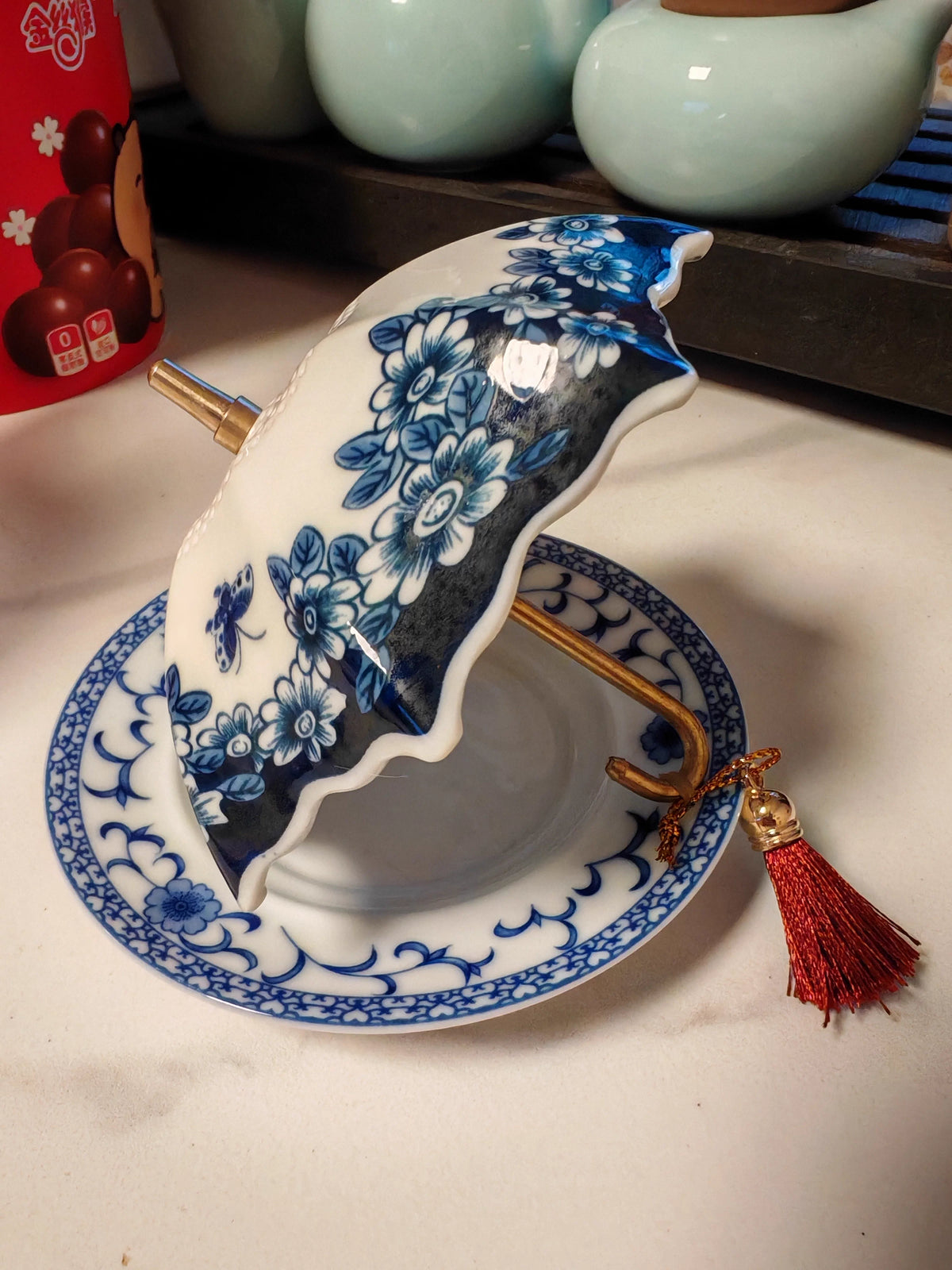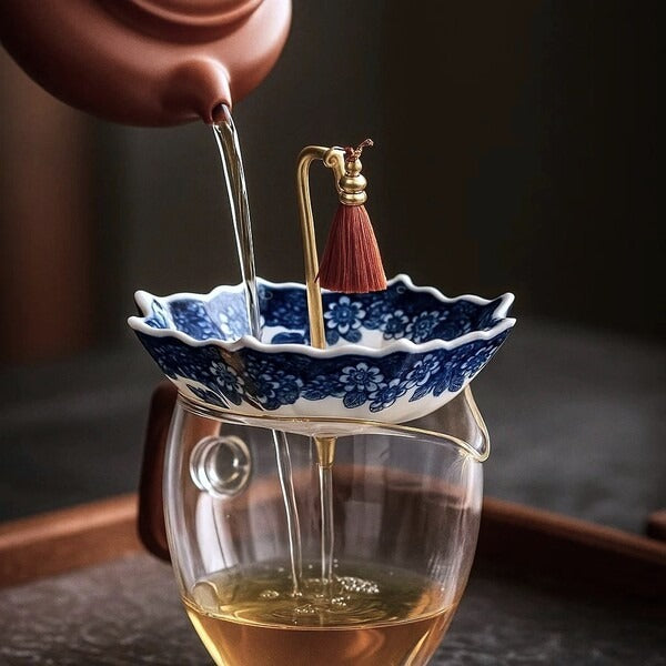 Ситечко из сине-белого фарфора с глазурованным покрытием. Мелкие отверстия задерживают даже чайную пыль — в чашке только чистый настой. Ручка в виде зонтика не нагревается и позволяет вынуть фильтр одним движением.
